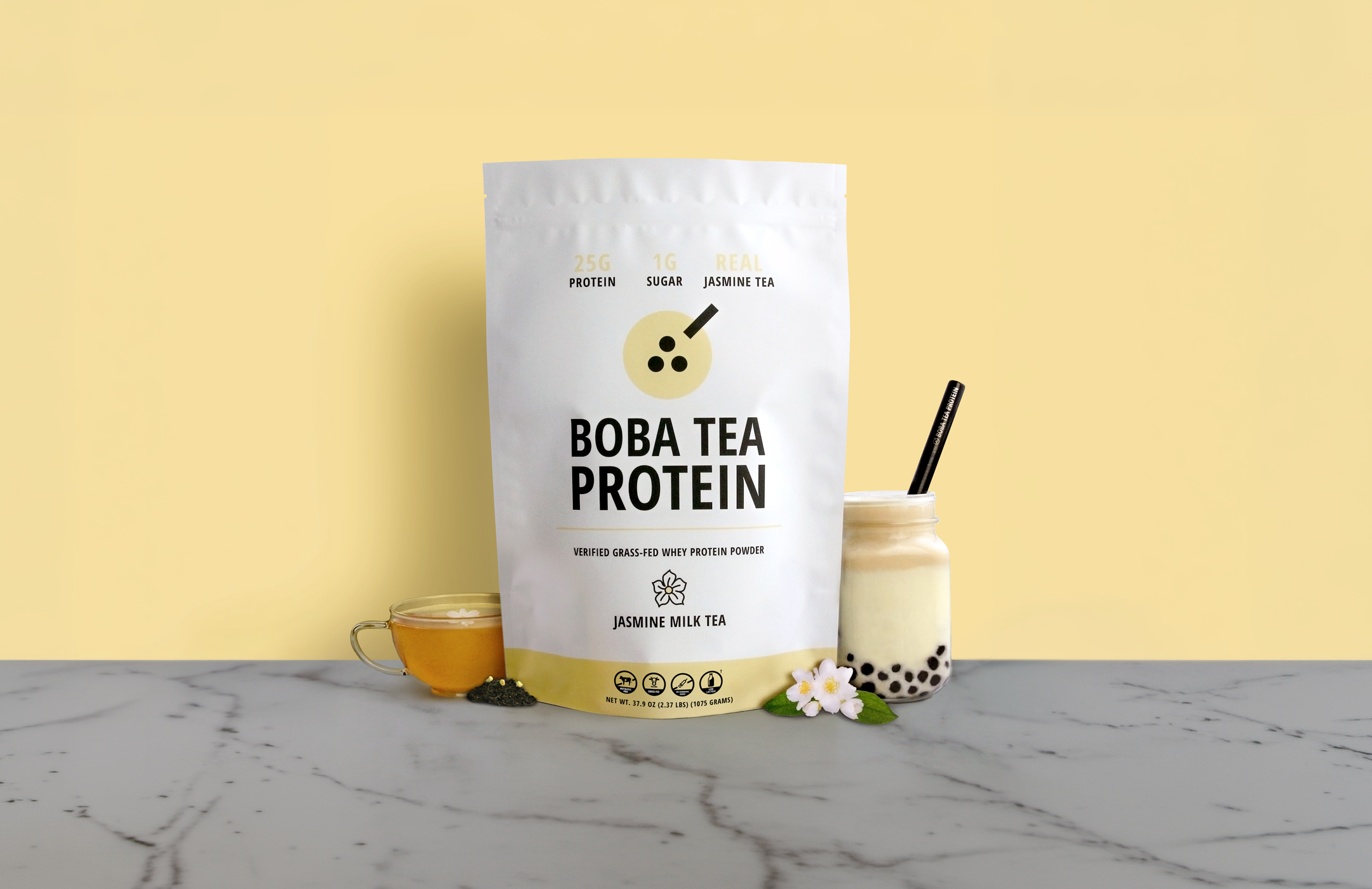 100% Verified Grass-Fed Whey Protein Isolate, Coconut Oil Creamer, Jasmine Tea Powder, Monk Fruit Extract, Salt