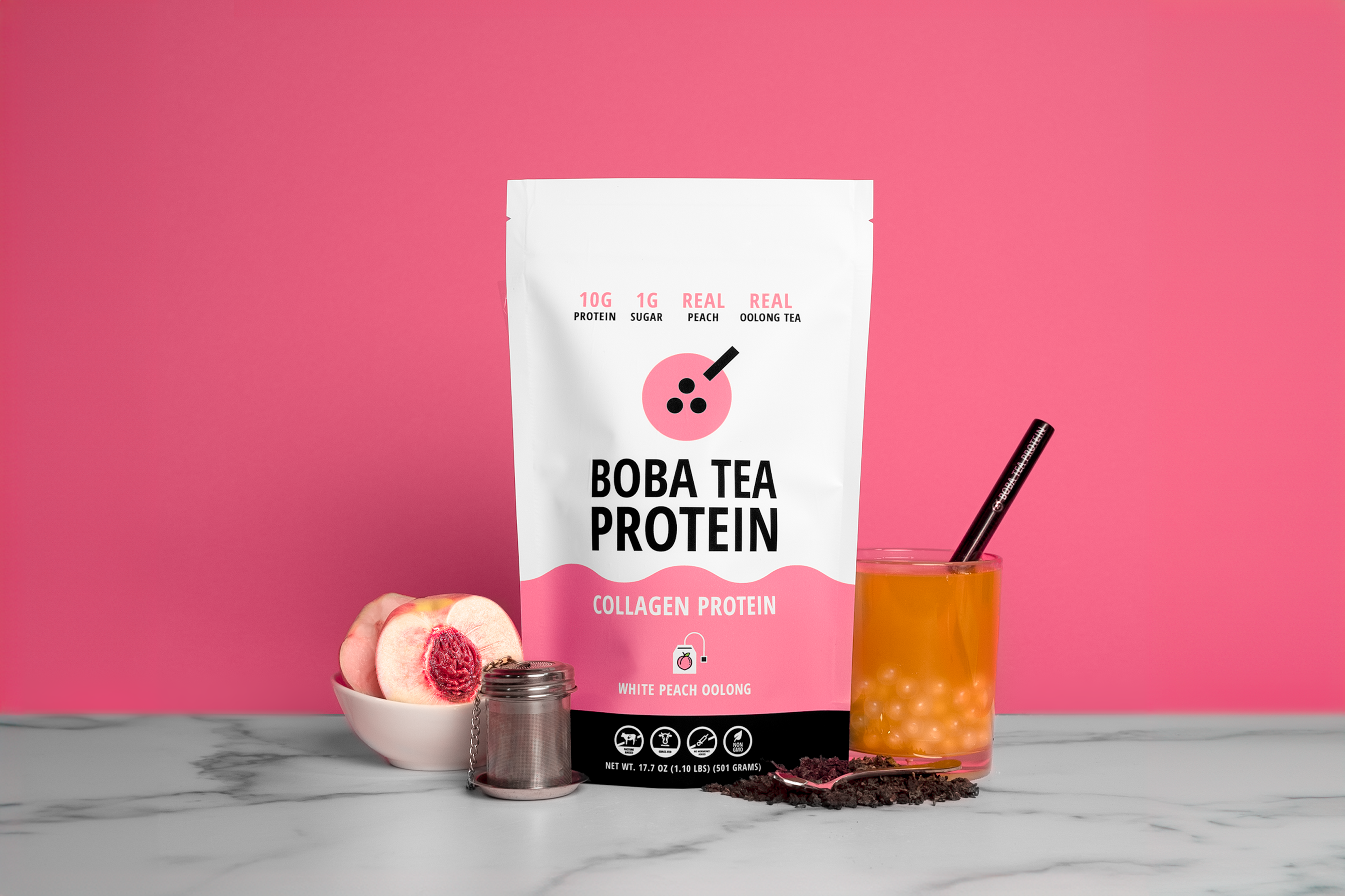 Our Peach Oolong Collagen Protein is a fruit tea drink that is made with real white peach, combined with an earthy, oolong tea from the Fujian tea region of China that gives pleasant, aromatic “roasted” flavor notes that blends perfectly with the fruity white peach notes.